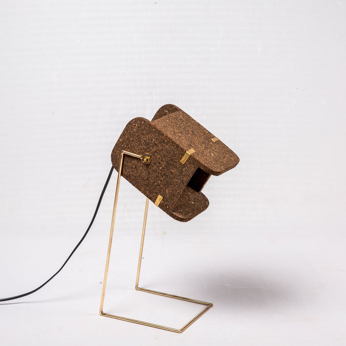 Contemporary form translates befittingly into a Jude table lamp, handcrafted from Dark/Light cork with brass finish metal fittings and stand, to garner a place of pride on any work desk.