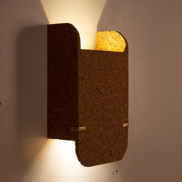 Drawing inspiration from modern forms, this big LED Jude wall lamp, handcrafted from light cork with brass finish metal fittings, is best suited for muted lighting in homes and hospitality spaces.