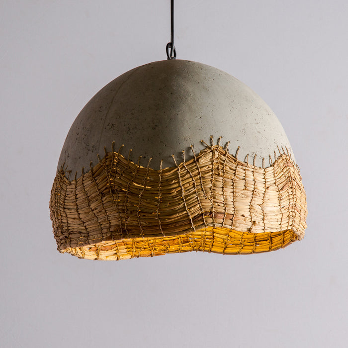 The faux concrete dome in this pendant lamp receives a contrasting touch from the weave made of water hyacinth fiber. Two natural elements are handcrafted to form this uniquely aesthetic hanging lamp to light up a living or hospitality space.